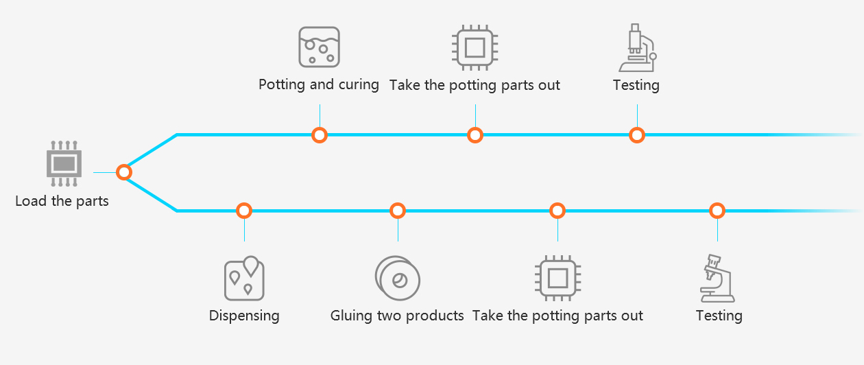 The complete process of PUR hotmelt glue injection molding/dispensing is composed of the hotmelt glue injection molding machine/dispenser, the mold set and the process parameters.